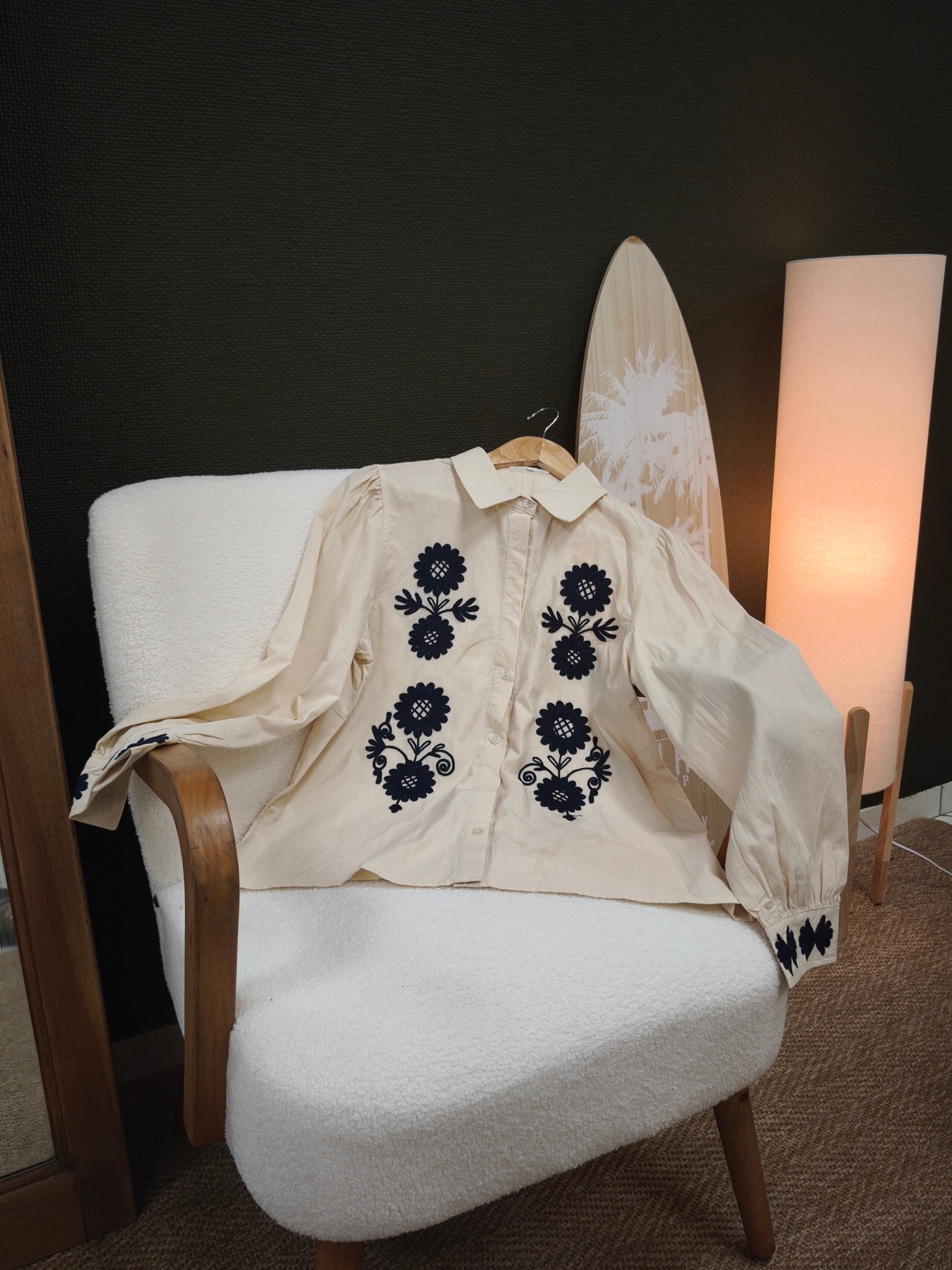 - Chemise beige avec détails fleurs bleu marine