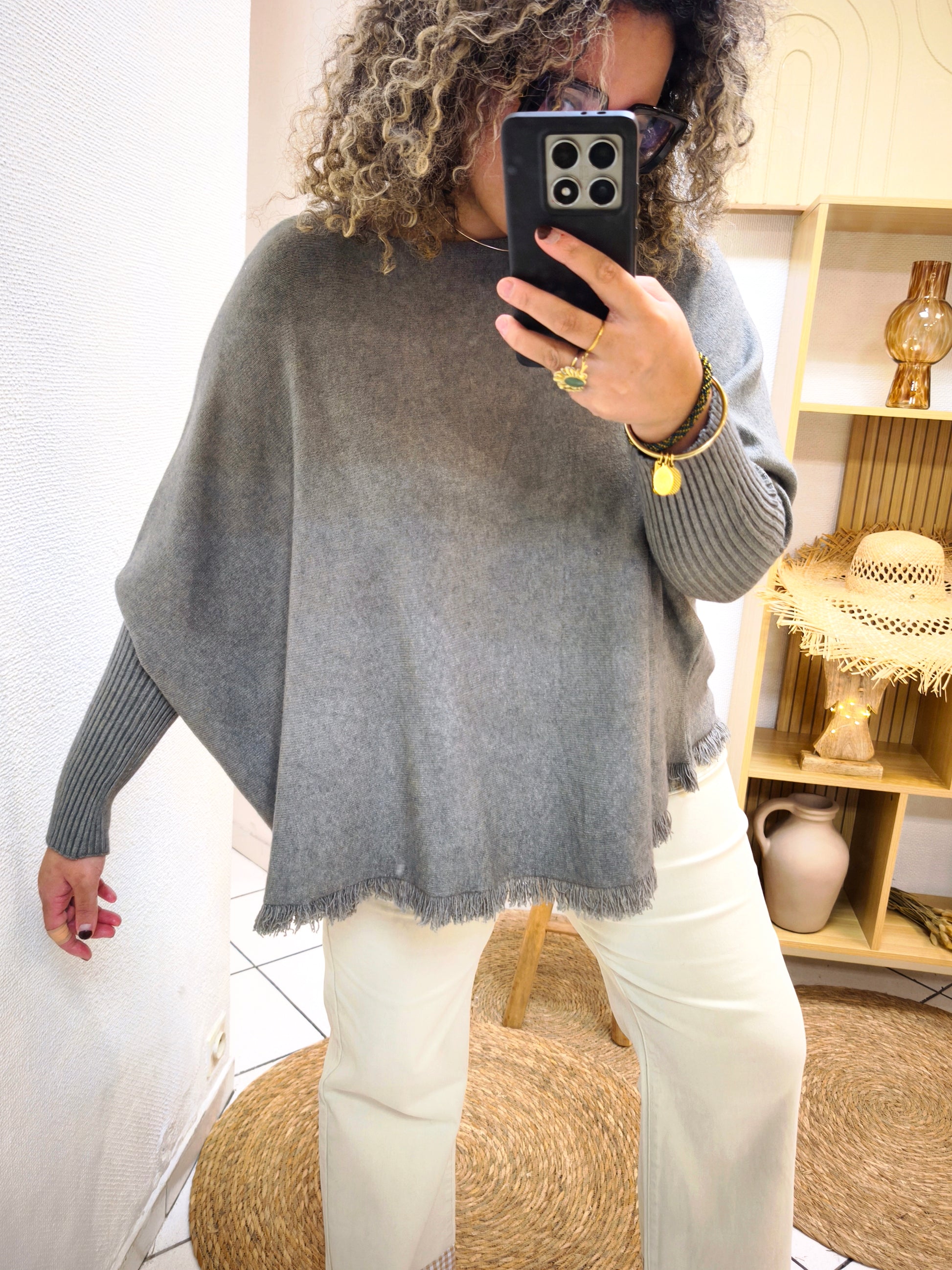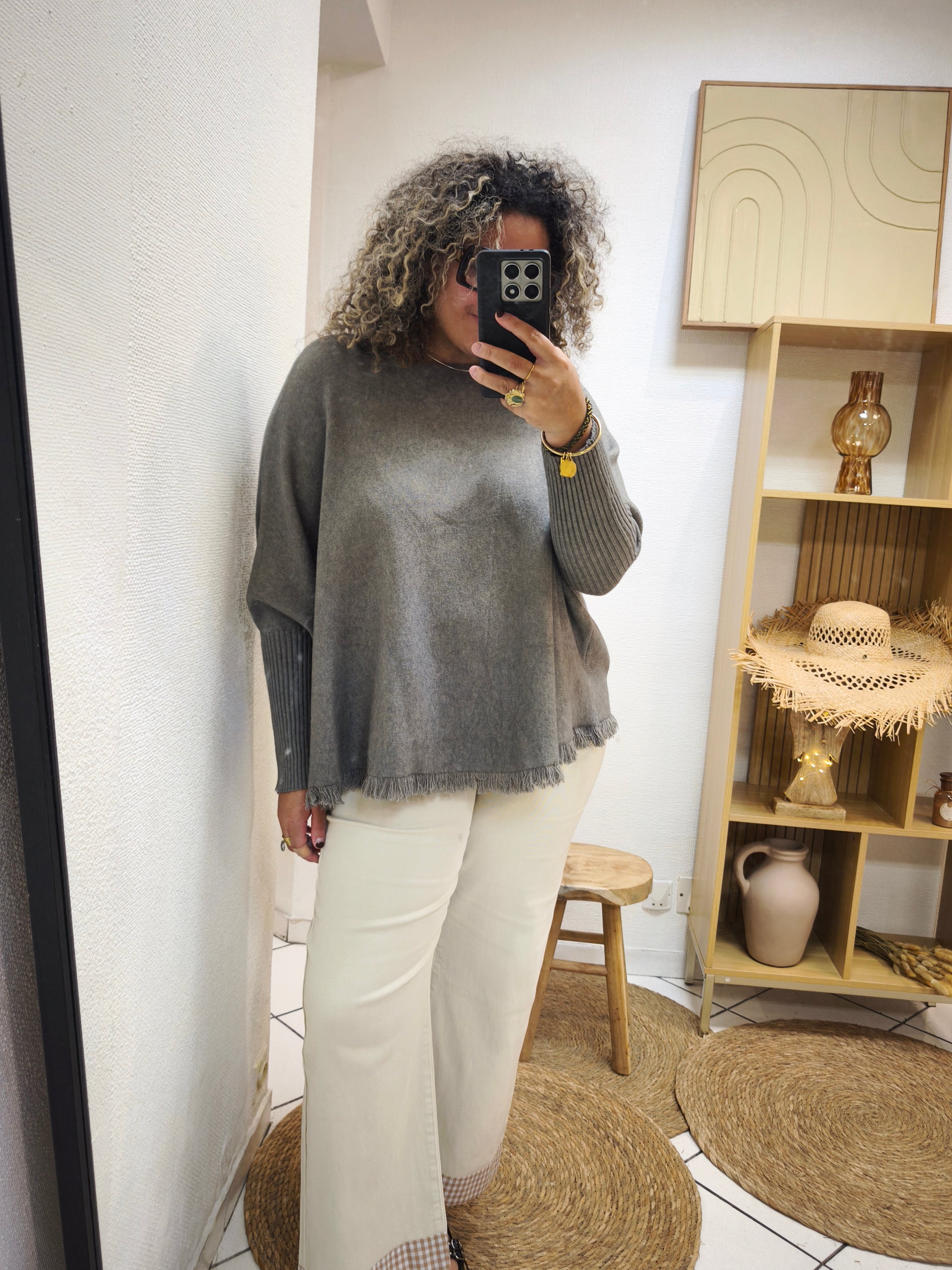 On adore sa coupe fluide, ses manches cosy et sa finition légèrement effilochée qui fait toute la différence. À porter sans modération, avec un jean ou un pantalon clair ✨